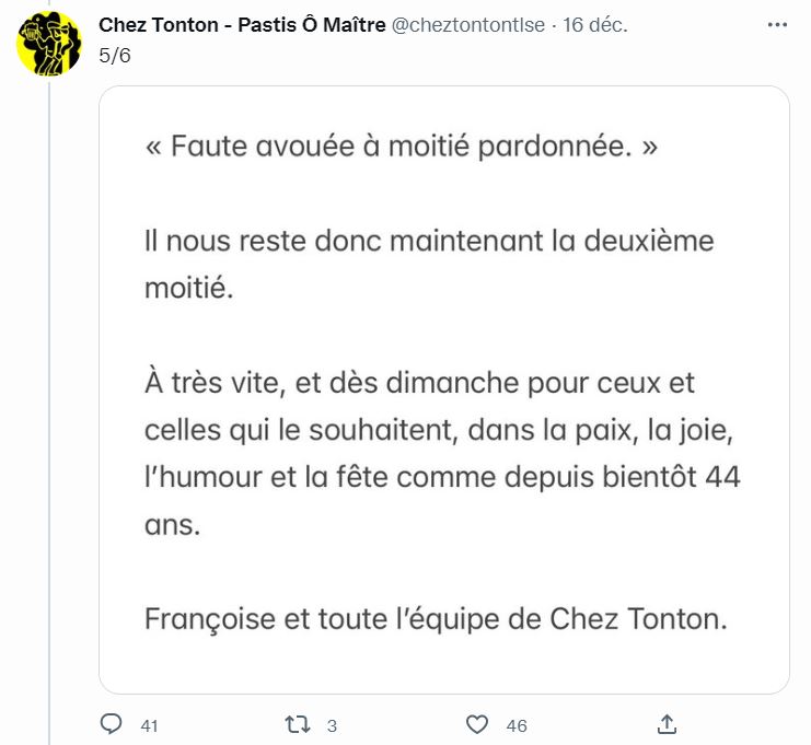 Mais c'est surtout un jeune homme en colère. Il souhaite que la justice fasse son travail, envers ses deux agresseurs mais également envers le bar, à qui il reproche "de ne pas assumer ses responsabilités". Dans le premier message diffusé sur Twitter le lendemain des faits, l'établissement a notamment écrit "Comme dans chaque incident, les torts sont partagés" et "faute avouée, à moitié pardonnée". Des phrases qui ne passent pas. Pour le jeune toulousain, qui de ses dire n'a "rien fait", pas question de minimiser : "Sur toutes les vidéos, on voit très bien de qui vient la violence. Et on voit aussi que toutes les personnes présentes ont les mains levées et leur crient de se calmer."