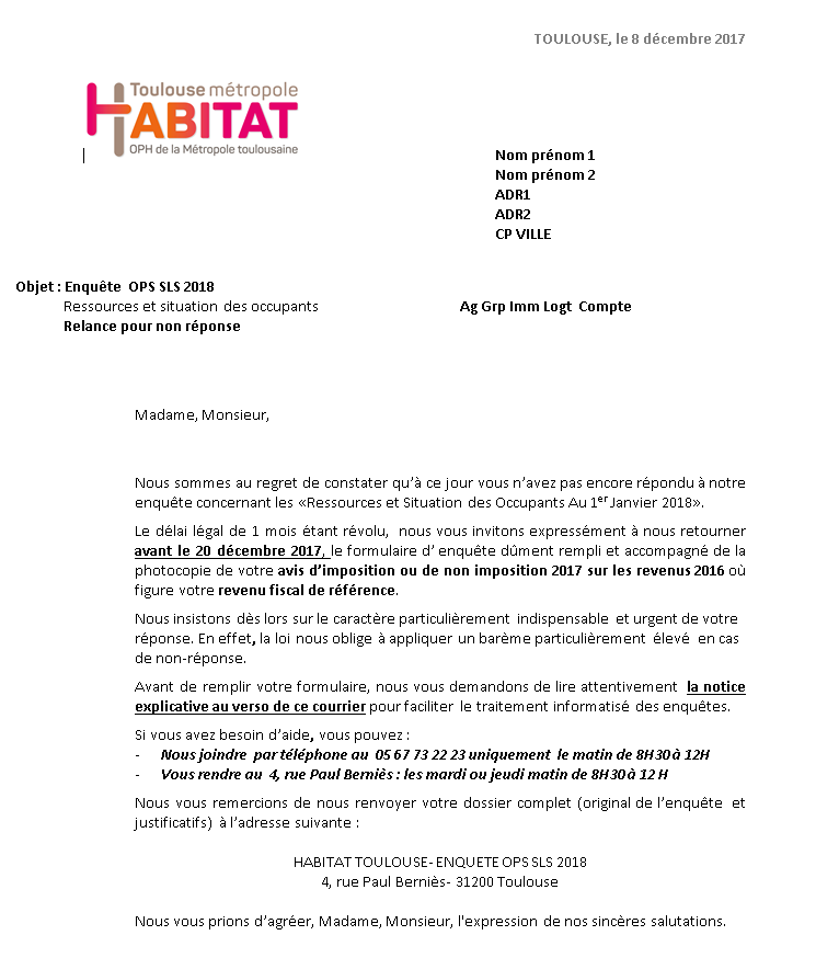 Toulouse Métropole Habitat adresse, en principe, le document par courrier affranchi à tous ses locataires, courrier suivi d'une relance s'il n'y a pas eu de réponse. Si le bailleur ne reçoit pas l’enquête complète : le locataire écope de 7,60€ de pénalité à payer tous les mois.