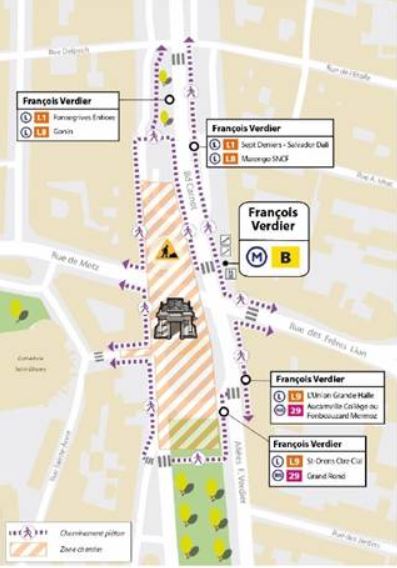 La rue de Metz et la rue Bertrand de l’Isle seront mises en impasse. La circulation des véhicules sur le boulevard Carnot et les allées François Verdier se fera à double sens (côté pair). La circulation des cycles sur le boulevard Carnot et les allées François Verdier se fera dans le sens Sud – Nord. Un itinéraire de contournement par la rue Delpech est proposé aux cycles dans le sens Nord - Sud. Le sens de circulation sur la rue Bida sera inversé. Circulation difficile donc en voiture entre J. Jaurès et le Grand Rond et « il y aura un vrai blocage entre le place Dupuy et la rue de Metz, d’où l’intérêt pour ceux qui arrivent de la Côte Pavée de réfléchir à des itinéraires alternatifs » mais « il y aura des fléchages ». Techniquement ce chantier est le plus compliqué de tous les chantiers de la 3e ligne, le disputant au chantier de Blagnac-Jean Maga également colossal.